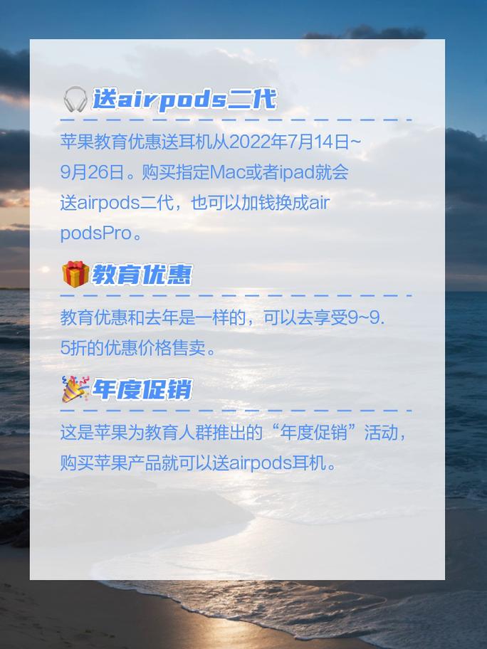 〖Five〗、苹果教育优惠赠送耳机的活动每年都会举行,主要集中在暑假返校季期间。2022年的活动从7月14日持续至9月26日,购买指定的Mac或iPad即可获得AirPods二代,而且教育优惠提供9『5』折的折扣。活动内容不仅限于赠耳机,还包括AppleCare+服务的8折优惠和ApplePencil、iPad的促销。