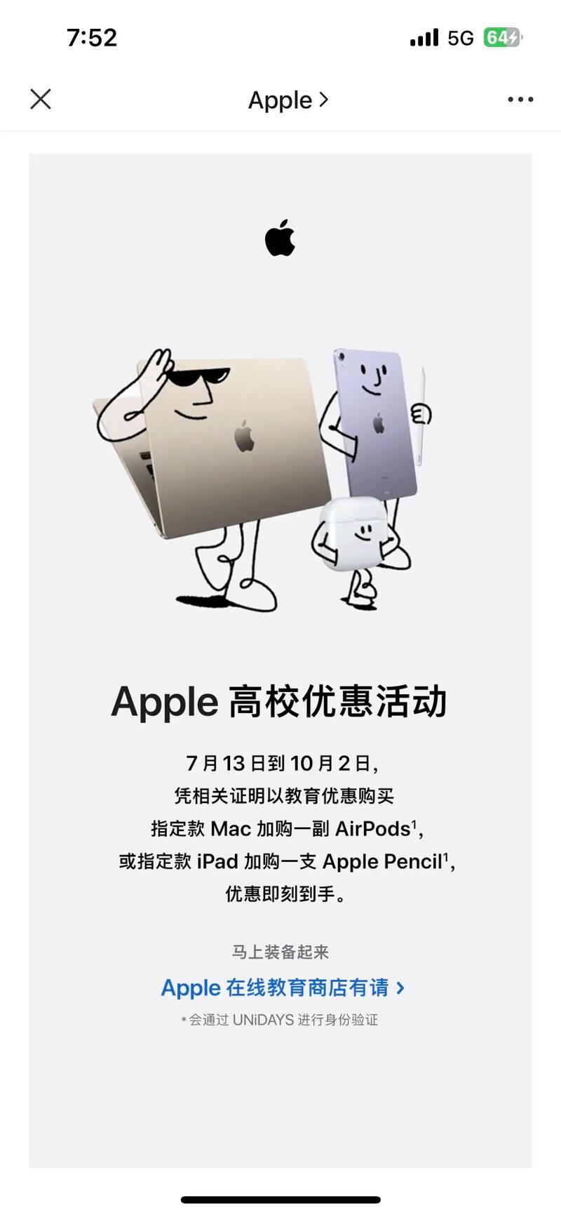 〖Two〗、苹果公司并没有全年365天都包含赠送耳机的教育优惠活动,但有一个特殊的暑期返校季促销活动。这个活动通常在每年7月启动,持续到9月结束,大约两个月的时间。购买指定的苹果产品,消费者将有机会获得官方定价1246元的AirPods耳机,这是苹果为教育用户设计的年度促销优惠。