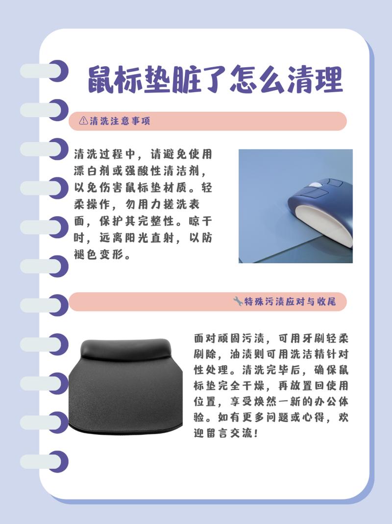 〖Five〗、鼠标垫脏了可以通过以下方法清洗: 湿洗方法 答案:对于布料鼠标垫,可以采用湿洗的方式。详细解释:材料准备:准备温水、肥皂和软毛刷。步骤:将鼠标垫浸泡在温水中,加入肥皂。用软毛刷轻轻刷洗鼠标垫表面,特别注意污渍较严重的区域。用清水冲洗干净后晾干。