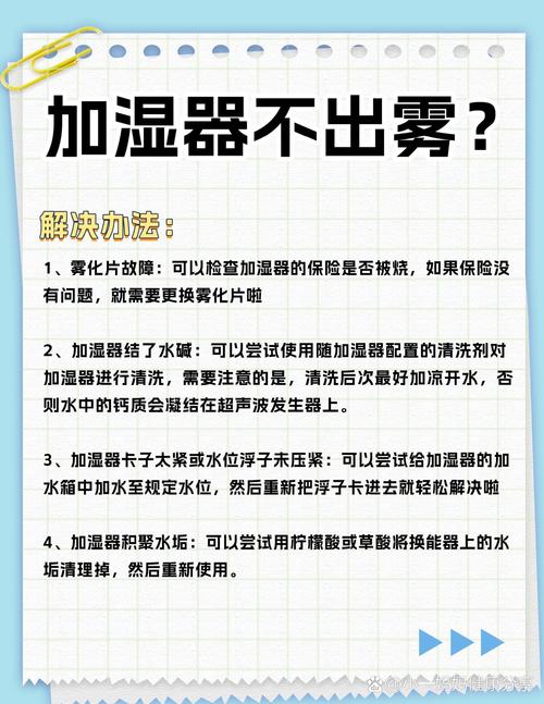 使用时间长的加湿器可能因自来水中的水垢在震荡片上沉积,导致有风无雾。解决方法:使用白醋和盐的混合物清洁,有助于溶解水垢,恢复雾气喷出。 若雾化片出现故障,也会导致加湿器不出雾。处理措施:首先检查保险丝是否烧断,如无问题,尝试调整电路板上的电位器,顺时针旋转四分之一圈。