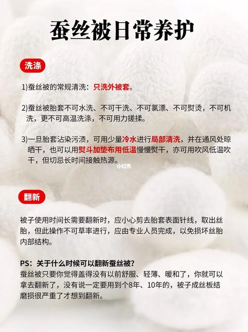 〖One〗、清洁丝棉被套:将丝棉被的被套拆下,单独放入清水中,加入适量洗涤剂轻轻揉搓清洗,直至被套污渍去除。 处理被芯污渍:若被芯上有污渍,不宜直接干洗、水洗或氯漂,以防损坏。建议送至专业的干洗店,使用专业的洗涤剂进行低温烘干处理。
