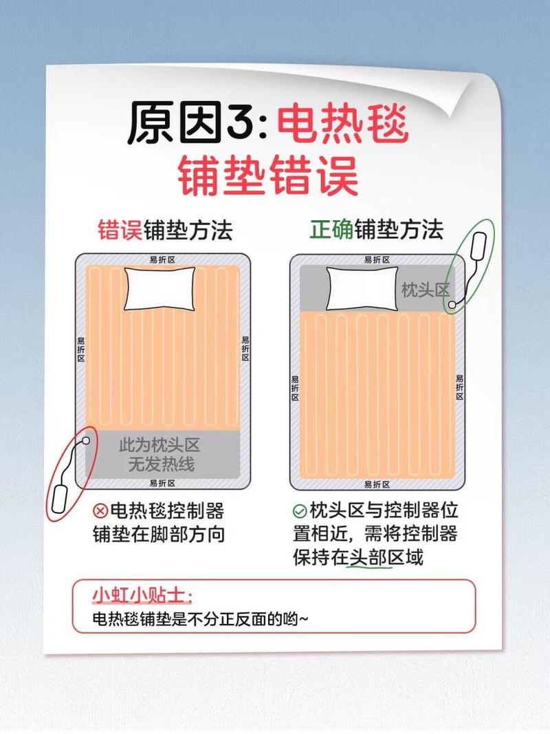 〖Five〗、电热毯的正确开启与使用方法: 安全铺设:使用电热毯时,切勿直接将其铺在有破损的床单上,以免温度升高时造成安全隐患。应将电热毯置于床单和床垫之间。 开启使用:铺设妥当后,您可以打开电热毯的开关,开始享受它带来的温暖。