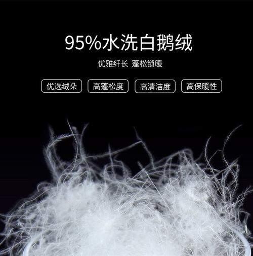 〖Two〗、95%白鹅绒丝指的是羽绒制品中白鹅绒的含量比例,即填充物中白鹅绒丝占95%。白鹅绒因其轻盈、高保暖性、长绒丝、大绒朵以及低异味等特点,是羽绒制品的理想填充物。在羽绒服中,95%的含绒量属于较高档次。