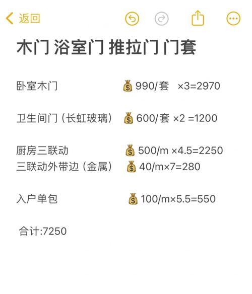 一个卫生间门的费用因多种因素而异,市场估计在每平方350到1500元不等。具体费用取决于以下几个方面:门的类型:推拉门、吊门还是平开门,不同类型的门费用会有所不同。例如,推拉铝合金门窗的费用一般较为便宜,可能在两三百元左右每平方。门洞大小:门洞的大小会直接影响到门的面积,进而影响总价。