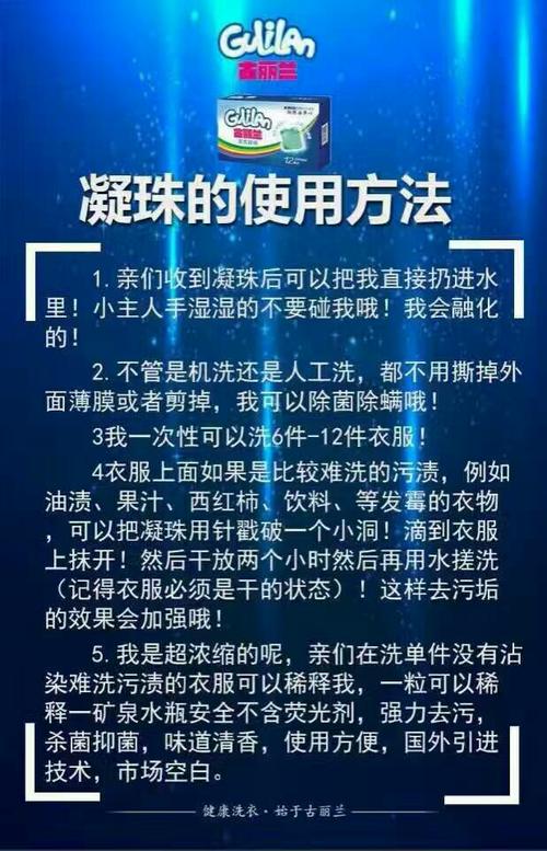 洗衣凝珠的使用方法:一颗洗衣凝珠可以清洁8『1』5件衣服,根据凝珠克数。取出洗衣凝珠:不要剪开或撕开洗衣凝珠。把洗衣凝珠放进筒内:请勿将洗衣凝珠放入料盒(产品可能卡在料盒堵住/塞流水)按衣物倒入启动洗衣程序:洗衣凝珠外膜遇水可溶洗后无残留。