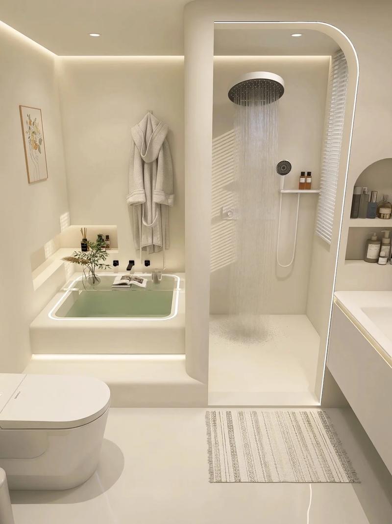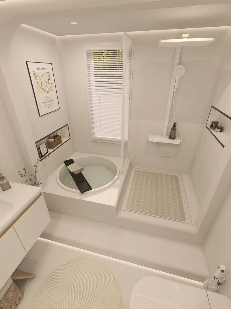 如果空间允许,浴缸可以横着摆放,这样便于进出和泡澡时的伸展。对于小空间,可以考虑使用长度较短但深度足够的坐浴浴缸,既节省空间又不影响使用舒适度。结合美观性和实用性:可以考虑将浴缸靠窗摆放,利用自然光线增加泡澡时的愉悦感。剩余空间可以设计成储物架,用于放置洗浴用品,既实用又美观。