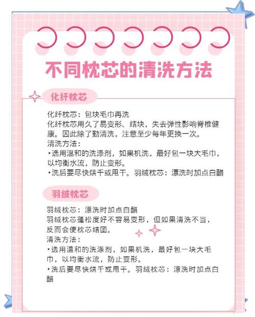 〖Two〗、对于纤维枕芯,如羽丝绒枕,可以手洗或机洗。 手洗时,应使用温和的洗涤剂,避免使用漂白剂或强酸强碱类清洁剂。机洗时,建议选取容量较大的洗衣机,并加入一块大毛巾一同洗涤,以均衡水流,防止枕芯变形。洗完后比较好烘干,有助于枕芯恢复弹性,保持柔软蓬松。