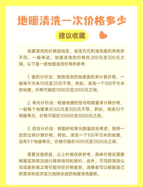 〖Two〗、地暖清洗的费用因地区、清洗方式和清洗面积而有所不同。一般来说,地暖清洗的费用在200元至500元之间。以下是一些地暖清洗费用的借鉴: 面积计价法:按照清洗的地暖面积来计算费用,一般每平方米10元至20元不等。例如,清洗一个100平方米的地暖,费用可能在1000元至2000元之间。