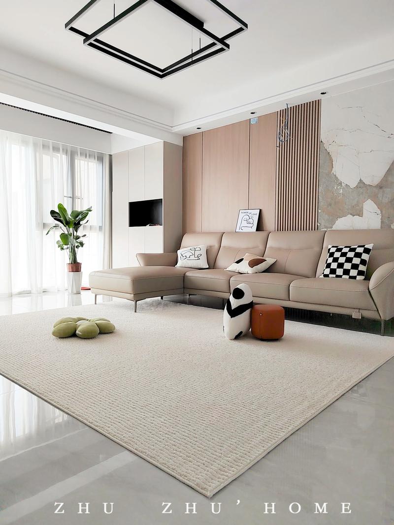 一般来说,不大于7m的沙发,建议使用7mX4m的地毯; 如果是较大的家具,2mX3m的地毯就足够了。 茶几的尺寸也应考虑在内,确保地毯、沙发和茶几保持标准比例。茶几地毯的尺寸一般不以茶几为基准。