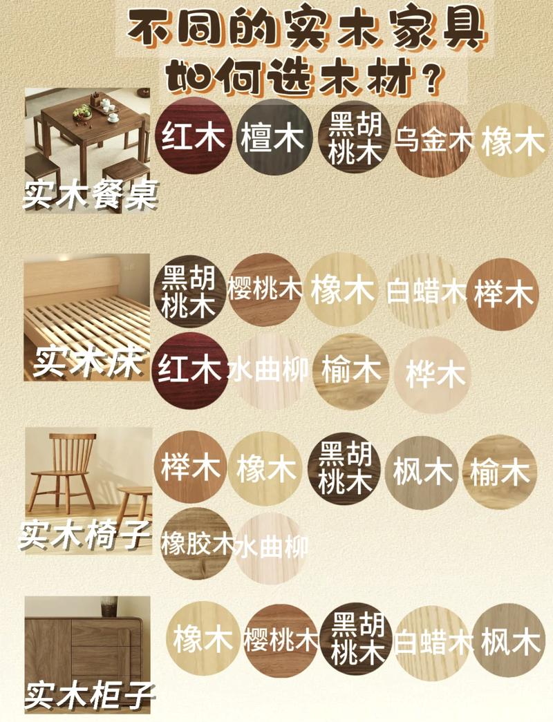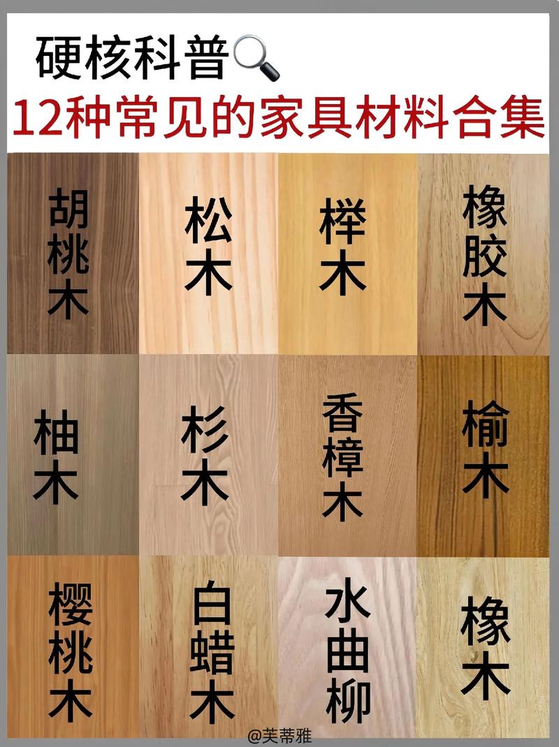 梓木:质地坚韧,稳定性好。1 柏木:天然芳香,防腐效果好。1 红豆杉:稀有珍贵,色泽艳丽。1 橡胶木:强度高,易于加工。1 樱桃木:纹理美观,色泽温暖。1 黑胡桃:质地细腻,抗变形能力强。1 橄榄木:色彩独特,风格多样。这些木材各有特点,适用于不同的家具制作需求。