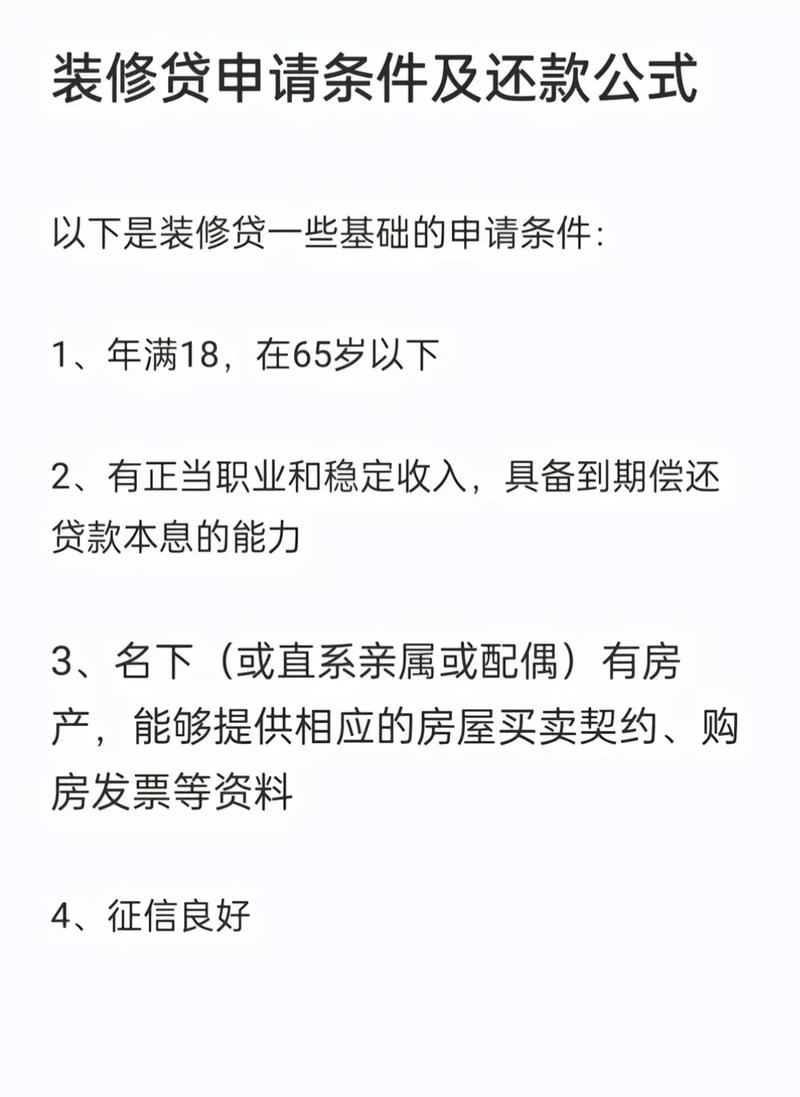 〖One〗、二手房贷款后是可以申请装修贷的,但需要满足以下银行的相关条件:身份和收入条件:申请人需具有城镇常住户口和有效的居民身份,具有稳定的职业和收入,信用良好,且有按期偿还贷款本息的能力。