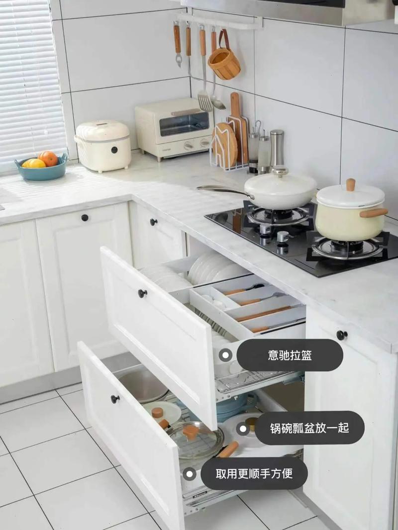 三角形吊柜:在厨房拐角上方安装一个三角形的吊柜,可以有效利用上部空间。这种设计不仅能增加储物空间,还能使厨房看起来更加整洁有序。上下结合设计:下方的橱柜可以设计得巧妙一些,如增加隔板等功能区域,上方的空间则可以安装隔板或吊柜,实现上下空间的充分利用。