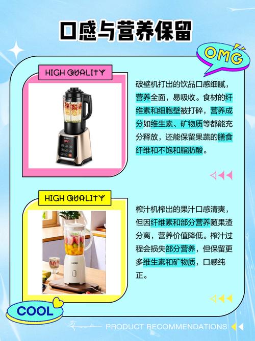 总的来说,破壁机和榨汁机各有千秋。破壁机在口感和营养成分上更胜一筹,适合追求高品质饮品的消费者;而榨汁机则更适合制作简单、快速的果汁。无论是哪种机器,都能为我们带来健康、美味的饮品。