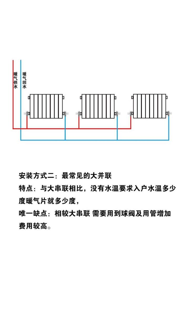 暖气片并联暖气片安装如下图:并联暖气片安装优劣势:暖气片并联是多个温控阀,多个管道,可以分别控制暖气片的温度,不会造成房间内温度不均匀的情况。万一暖气片出现了事故(漏水或腐蚀),可以关闭此组暖气片的温控阀,进行维修和更换,其他的暖气片不受影响。