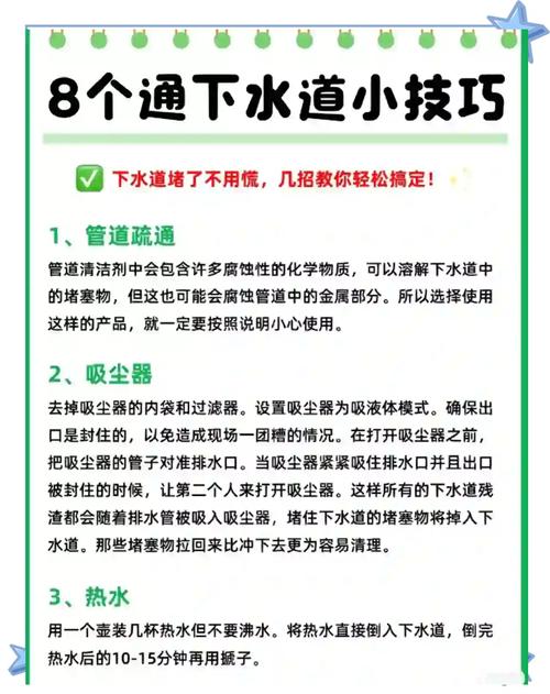 下水道被沙子水泥块堵住,可以采取以下方法进行清理:用水冲刷:立即行动:发现堵塞后,应立即用水进行冲刷,水流越大越好,持续时间也要尽量长。辅助方法:如果下水道是铁管,可以尝试在冲刷的同时振动或敲击铁管,这有助于水泥块的松动。