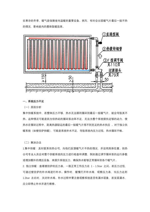 暖气片最后一组不热的原因有多种,主要包括管道问题、过热器故障、水压不足、温控阀故障、空气积聚等。针对这些问题,可以采取以下解决办法:首先,检查并调整管道上的平衡阀,确保热水能平衡流入各组暖气片。其次,检修过热器,确保阀门和气阀处于打开状态。