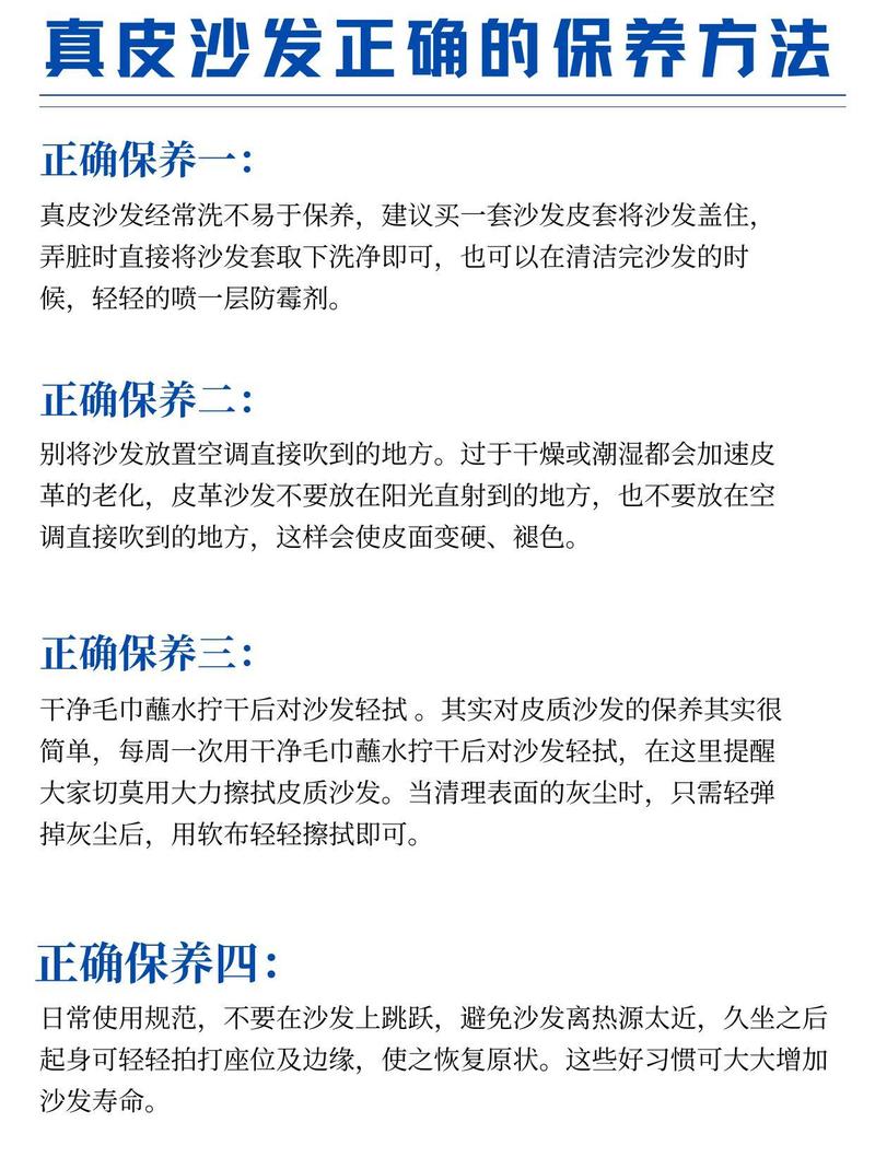 〖Four〗、初次保养 在真皮沙发刚刚购置回家时,首先需要对其进行初步的保养。您可以使用温水和软布轻轻擦拭沙发表面,接着使用专门的保养剂进行擦拭。这样可以在沙发上形成一层保护膜,有效防止日后的污染。日常保养要点 清洁:日常使用中,先用干布去除沙发表面的灰尘,再用柔软的湿布擦拭。