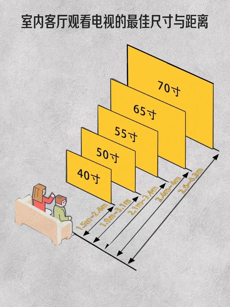 若观看距离在3米至5米之间,可以选取65寸、75寸、78寸或85寸的电视。 因此,在3米的观看距离下,选取65寸或55寸的电视都是合适的。 计算电视尺寸的一种方式是根据客厅面积。如果客厅面积在25到30平方米之间,适合选取44到50英寸的电视。 客厅的观看距离也很重要。