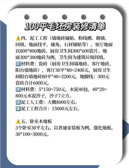 〖One〗、平毛坯房装修费用因装修风格、材料选取等因素而异,大概在10万元至数十万元之间。装修费用概述 对于100平方米的毛坯房,装修费用受多种因素影响,如装修风格、材料品质、施工细节等。一般来说,简单的装修费用较为经济,而高端豪华的装修则费用较高。