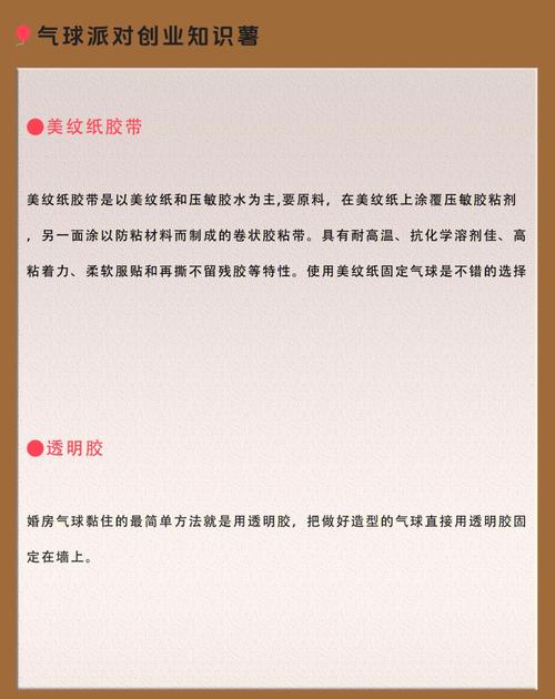 〖Five〗、双面胶:是一种常用的粘贴工具,其两面都带有粘性,可以很好地固定气球。使用双面胶时,只需将气球与墙面相应位置比对后,撕下双面胶的隔离膜,粘贴即可。双面胶的粘性适中,既不会损坏墙面,又可以牢固地固定气球。透明胶带:透明胶带也是粘贴气球的不错选取。