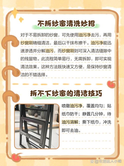 〖Two〗、厨房纱窗上的油烟可以用以下几种方法快速清洗:使用面糊清洗法:将面粉与水搅拌成面糊,刷在纱窗上。等待面糊干燥后,用自来水冲洗掉纱窗上的脏东西和面糊。优点:适用于带有大量灰尘或厨房油烟味浓的纱窗。清洁剂擦拭法:卸下纱窗,用浸有清洁剂的布大力擦拭,或用刷子刷洗。