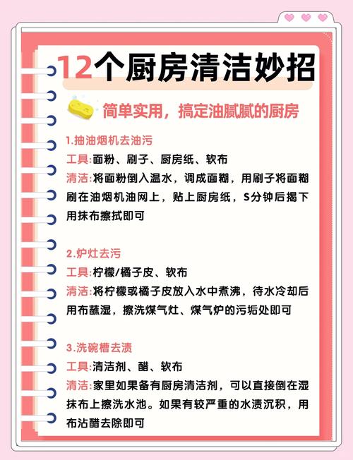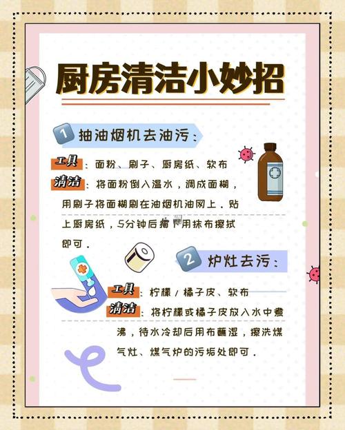 〖Five〗、清洁锅灶的方法和清理灶台污垢的妙招主要包括以下两种:用面粉清洗:步骤:保持灶台表面干燥,均匀撒上一层面粉,确保边边角角都覆盖到。原理:面粉具有很强的吸油污功能。操作:用百洁布轻轻擦洗面粉,面粉与灶台的摩擦可以带走油腻的污渍。