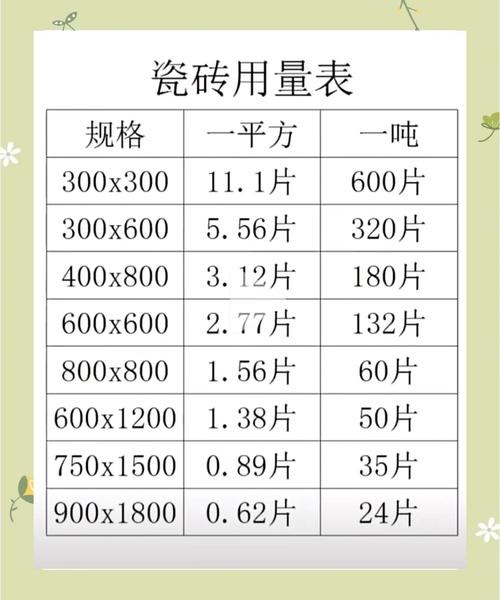 〖Three〗、计算地板砖数量:将地面面积除以每块地板砖的面积,即可得到所需的地板砖数量。考虑到铺设时可能会有损耗,建议额外准备一些地板砖以备不时之需。例如,如果地面面积为20平方米,使用30cm×30cm的地板砖,那么需要的地板砖数量为:/=约222块。