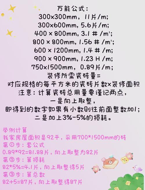 〖Five〗、方法一:户型长 * 宽 ÷ 瓷砖的长 * 宽 + 3%的损耗。方法二:面积 ÷ 瓷砖面积 * 1。方法三:使用图纸进行排布,精确计算每一个瓷砖的数量及大小,这是较为精准的方法。在计算过程中,务必确保所有测量单位的一致性,避免因单位换算错误导致计算结果不准确。