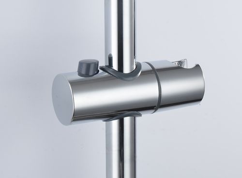 〖Three〗、选取好固定位置,一般高度在80公分到90公分左右,距离墙体5~6公分。用铅笔标记底座位置,用电钻打孔,然后用橡皮锤把膨胀螺丝敲入孔内,并用螺丝刀固定螺丝和底片。安装恒温花洒:将恒温花洒固定在恒温器处,连接口为4分接口。松开六角螺丝,缠绕5~10圈防水胶带后固定。