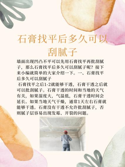 〖One〗、石膏找平后,需要等待其完全干透才能开始刮腻子。一般来说,如果施工环境比较干燥,石膏在1『2』天内就可以干透;而如果施工环境湿度较大,比如潮湿多雨的天气,那么石膏可能需要更长的时间才能彻底干透,建议等待至少24小时后再进行刮腻子。