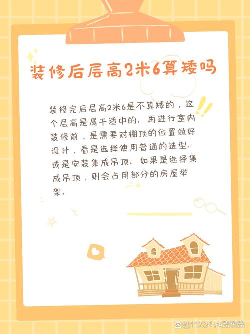 装修完后层高2米6不算矮。以下是对该问题的详细解符合国家标准:按国家规定标准,房屋室内净高不应低于20米。现在普通的室内吊顶离地一般是4米至6米。因此,装修后层高6米是符合国家标准且比较合理的。