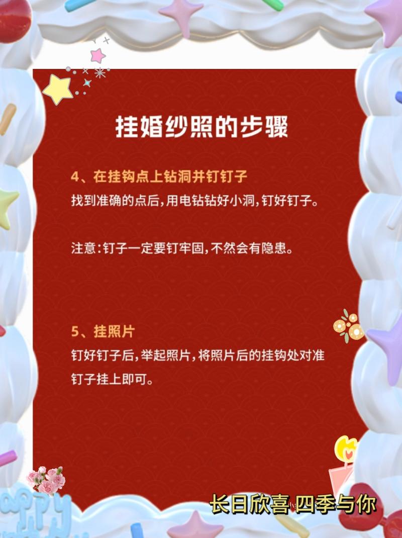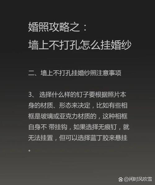 〖Three〗、婚纱照不用钉子可以通过挂钩或胶水挂在墙上。挂钩:可以在超市里购买一些平头钩,这些挂钩通常配有双面胶带。将双面胶带贴在挂钩上,并确保墙面清洁无尘,然后将挂钩粘贴在墙上。之后,将婚纱照挂在这些挂钩上即可。胶水:使用强力胶,如502胶水,将其涂抹在相框的背面,然后直接粘贴在墙面上。