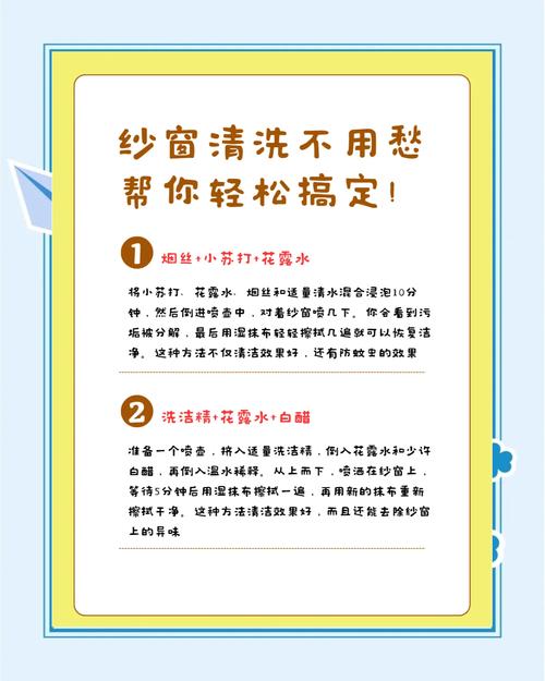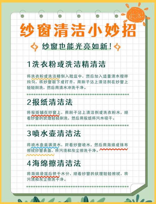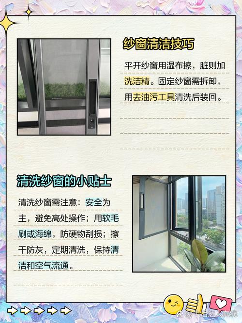 〖Five〗、小苏打则具有较强的去污能力。将纱窗浸泡在混合溶液中一段时间,再用刷子轻轻刷洗,能去除顽固油渍。对于一些材质特殊、不便拆卸的纱窗,还可以使用专业的纱窗清洁剂。将清洁剂均匀喷洒在纱窗上,稍等片刻,让清洁剂充分分解污垢,然后用湿布擦拭,最后用干净的湿布再擦一遍,去除残留的清洁剂。