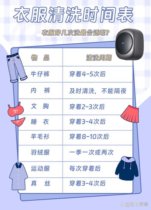 由于这些衣物容易沾染汗液,会滋生病菌,因此建议每次穿后就洗。袜子:虽然未明确说明清洗频率,但建议每天更换,并根据脏污程度及时清洗,清洗时水温不宜超过40℃,以防袜子缩水、硬化。文胸:每天更换,不要连续两天穿,清洗时建议使用肥皂,冷水手洗,平铺晾干。贴身睡衣:穿3~4次后清洗。