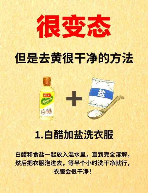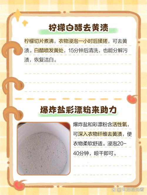 〖Four〗、方法一:白醋加洗衣液法在温水中加入适量白醋和洗衣液,将衣服浸泡其中1 - 两小时,之后正常洗涤,白醋能软化黄渍,利于去除。方法二:柠檬汁法把柠檬汁挤在黄渍处,用手轻轻揉搓,再放置一段时间,然后用清水漂洗干净,柠檬的酸性成分可分解污渍。