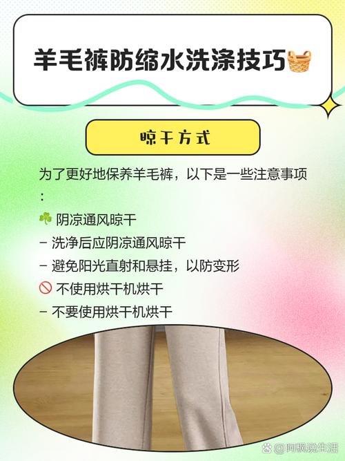 〖Four〗、羊绒裤洗涤不缩水的方法如下:选取合适的洗涤剂:选取中性温和的洗涤剂,与水按3%的比例混合进行洗涤,避免使用碱性过强的洗涤剂。控制水温:水温不宜过高,也不宜过冷,35度左右为宜。过高的水温可能会导致羊绒缩水。手洗并避免揉搓:避免机洗,尽量手洗。