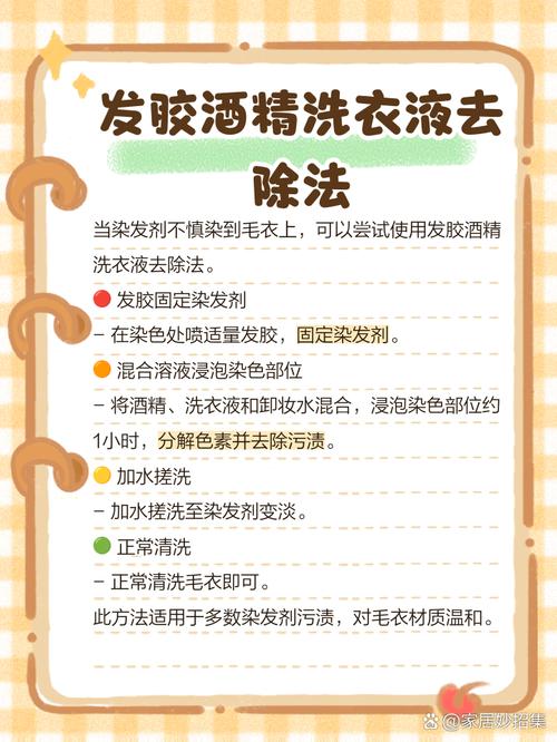 若不慎将染发剂沾染到衣物上,可尝试用陈醋轻轻擦拭染有染发剂的区域。 使用专为彩色衣物设计的漂白剂,如白猫彩漂,可能有助于去除染发剂的痕迹。 将衣物在稀释后的84消毒液中稍微浸泡,注意稀释比例和浸泡时间,因为这些因素会影响漂白效果,可能需要多次处理以确保染发剂完全去除。