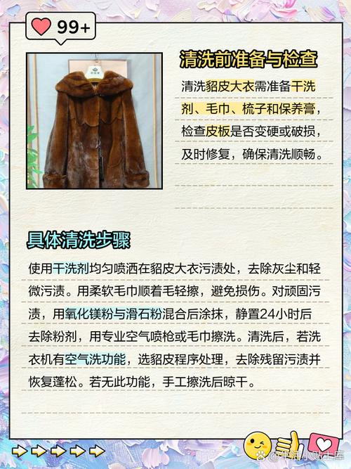 〖One〗、使用酒精:轻微的油渍可以用蘸有酒精的棉签轻轻擦拭。这种方法能有效减轻貂皮上的油渍痕迹。 应用专用清洁剂:对于更顽固的油渍,可以喷洒适量的专用清洁剂在衣物的脏污部分,然后用干净的湿布擦拭。在擦拭时,应顺着貂皮的毛发方向进行,避免横向擦拭,以免损伤大衣。 专业店清洗:如果条件允许,可以将貂皮大衣送至专业的皮草清洗店进行处理。