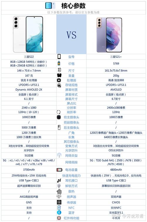 〖Three〗、外观设计首先,S21+和S22+在外观设计上有所不同。S21+采用了类似于竖条形的相机设计,而S22+则采用了更加圆润的外观,相机模块也更加突出。此外,S22+还采用了全新的“水滴状”摄像头设计,整体看起来更加时尚。硬件配置在硬件配置方面,S22+相比S21+有了一些升级。