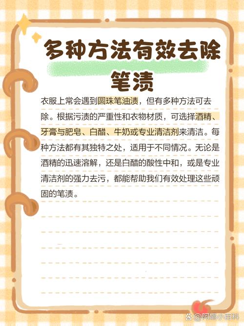 〖Four〗、衣服上的圆珠笔油可以通过以下几种方法洗掉:使用酒精:将酒精滴在衣服上有圆珠笔油的地方。等待片刻,让酒精溶解笔油污渍。注意不要用手揉搓,以免污渍扩散。使用汽油:将汽油滴在衣服上的圆珠笔油污渍处。汽油同样可以有效溶解笔油痕迹。使用汽油后,需确保彻底清洗衣物,以避免汽油残留。