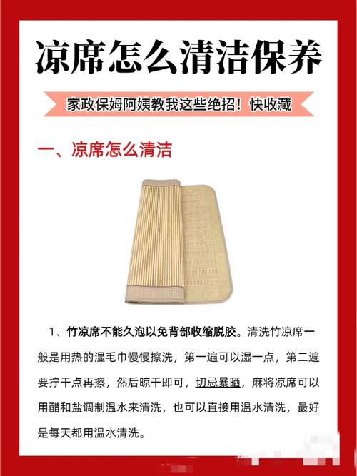 〖Four〗、竹凉席不可用水直接清洗,要用温水毛巾擦拭,不要放在太阳下暴晒,以免变脆开裂,置于阴凉通风处晾干即可。藤席。藤席有人造的也有天然的,质地柔软滑爽,但费用昂贵。藤席不能用化学洗涤剂擦拭,可用温水浸过的潮湿毛巾将表面擦干净,清洗干净后放于阴凉处晾干,不能曝晒。草席。