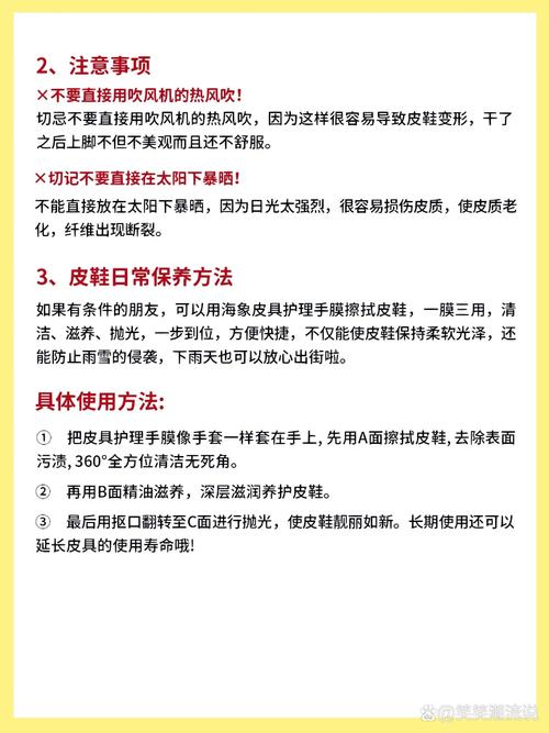 自然干燥:将皮鞋放置在阴凉通风的地方,让其自然干燥。切勿暴晒或用吹风机吹,以免皮革受损。补充油脂:皮鞋干燥后,可以使用一些过期的面油擦拭皮鞋,以补充因泡水而损失的油脂,保持皮革的柔软和光泽。防止变形:自然风干后,在鞋子内部放入报纸,以保持皮革的弹性和防止皮鞋变形。