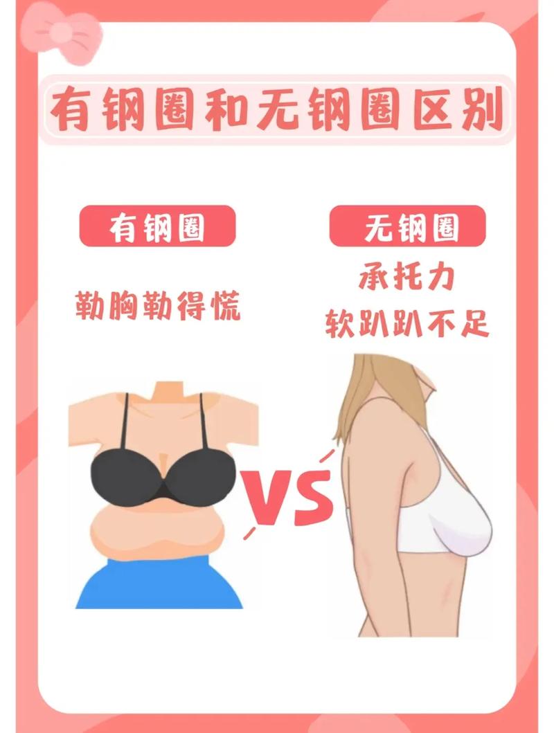 〖Two〗、内衣有钢圈和无钢圈各有其优缺点,适合不同需求和场合。以下是它们的主要区别:有钢圈内衣: 主要优势:承托和稳定效果好,能有效美化胸型。 适用人群:尤其适合胸部偏大的女性,有助于避免胸部下垂、外扩、松弛等问题。 使用场合:适合上班或重要场合,能让形体看起来更完美。