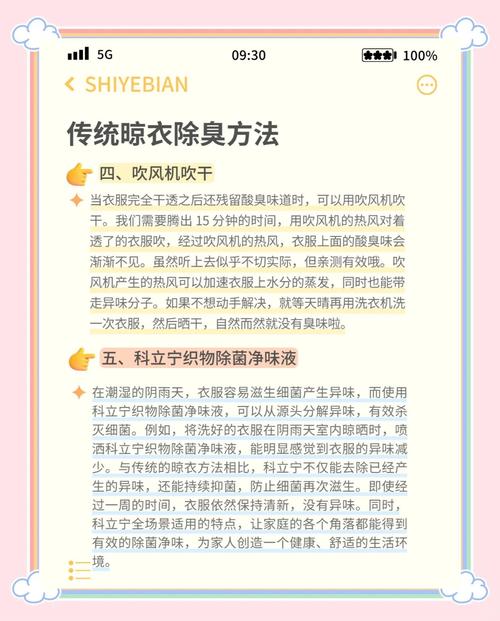 〖Three〗、拯救晾臭的衣服,可以采取以下几种方法:重新清洗:原因:衣服变臭通常是因为细菌滋生。操作:将变臭的衣服重新放入洗衣机或手洗,使用适量的洗涤剂和清水进行彻底清洗。效果:清洗后可以去除大部分细菌和异味。充分晾晒:操作:清洗后的衣服应放置在太阳下充分晾晒,确保所有部分都能接受到阳光直射。