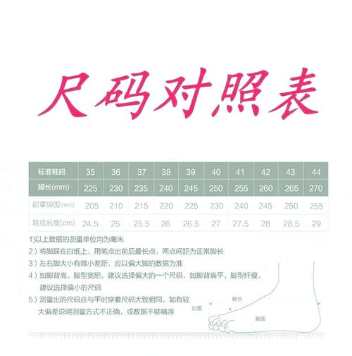 〖Five〗、比较好是测量它的内长。根据内长,再对照相应的尺码表,就能得出准确的鞋子尺码。因此,不能仅凭鞋子的外长来确定尺码。常见尺码对应:虽然27cm的外长可能对应37码,但这并非绝对,因为不同品牌和款式的鞋子在尺码上可能存在差异。所以,在购买鞋子时,比较好还是以测量内长并对照尺码表为准。