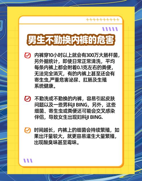 男士内裤应尽量避免隔夜洗。由于内裤是贴身衣物,容易沾染分泌物,这些分泌物含有蛋白质和无机盐,如果不立即清洗,可能会促进细菌和微生物的繁殖。此外,隔夜后内裤可能产生异味,吸引蚊蝇等昆虫,这些昆虫可能携带病菌,使得清洗更加困难,不易彻底清洁。建议男士内裤每3到6个月更换一次。