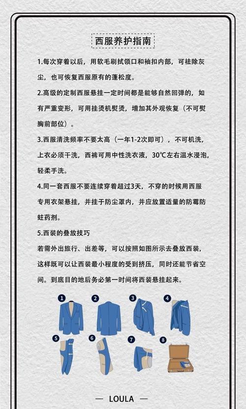〖One〗、减少洗涤频率:毛呢西装不宜频繁清洗,因为过度洗涤会破坏羊毛纤维的结构,导致衣物变形和缩水。建议在穿着过程中尽量减少洗涤次数,只在必要时进行干洗或湿洗。正确挂放:在不穿着时,应使用宽肩衣架将西装挂好,避免使用金属衣架,以免肩部留下难看的挂痕。同时,确保衣架的宽度足以支撑西装的肩膀,防止西装变形。