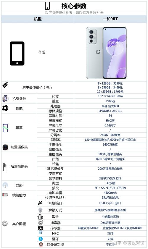 缺点:一加9RT没有独立耳机接口,不支持红外遥控功能。配置情况:一加9RT的核心配置包括骁龙888处理器、LPDDR5内存、UFS 1闪存、120赫兹E4材质1080P直面屏、5000万像素主摄+1600万像素超广角200万像素微距镜头、4500毫安电池、65W有线闪充等。