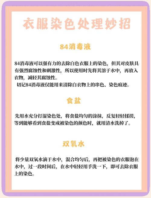 〖Five〗、使用柠檬汁和盐:将柠檬汁挤在染色处,撒少量盐轻轻搓洗,再放阳光下晾晒加速褪色,一次效果不好可多试几次。专业处理:送专业洗衣店或干洗店处理。需注意,上述后三种方法可能损害衣物材质,使用前要先进行小范围测试,并确保仅在污色部分操作。