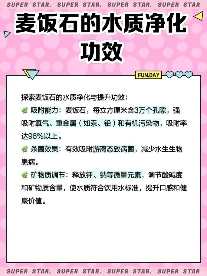 在净化水质方面,麦饭石具有显著的效果。可以将适量的麦饭石放入水中,通过其多孔性和吸附性,去除水中的杂质和异味,使水质得到改善。一般来说,按照5斤水:1斤麦饭石的比例,90分钟内水质即可得到明显改善。